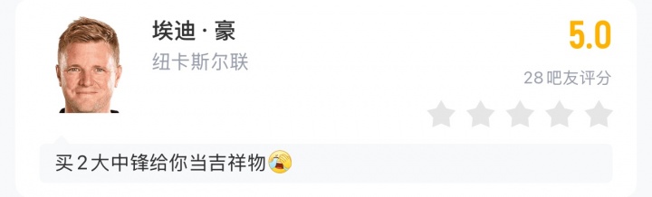纽卡1-1巴萨,埃迪·豪吧友评分5.0分